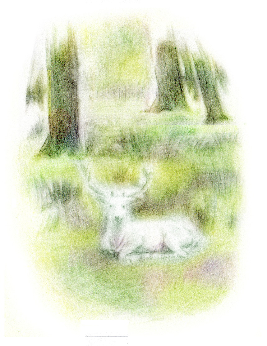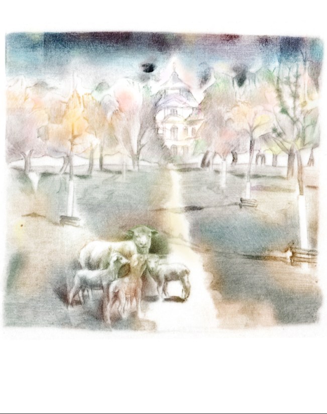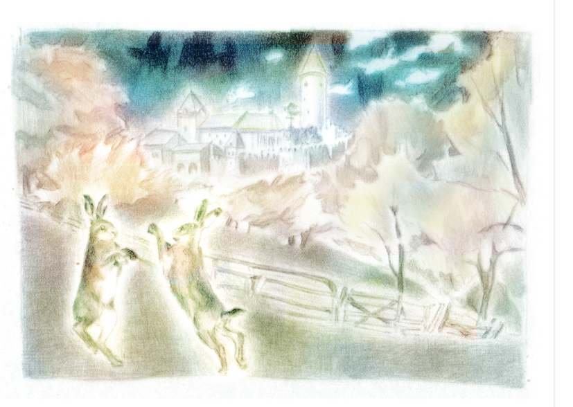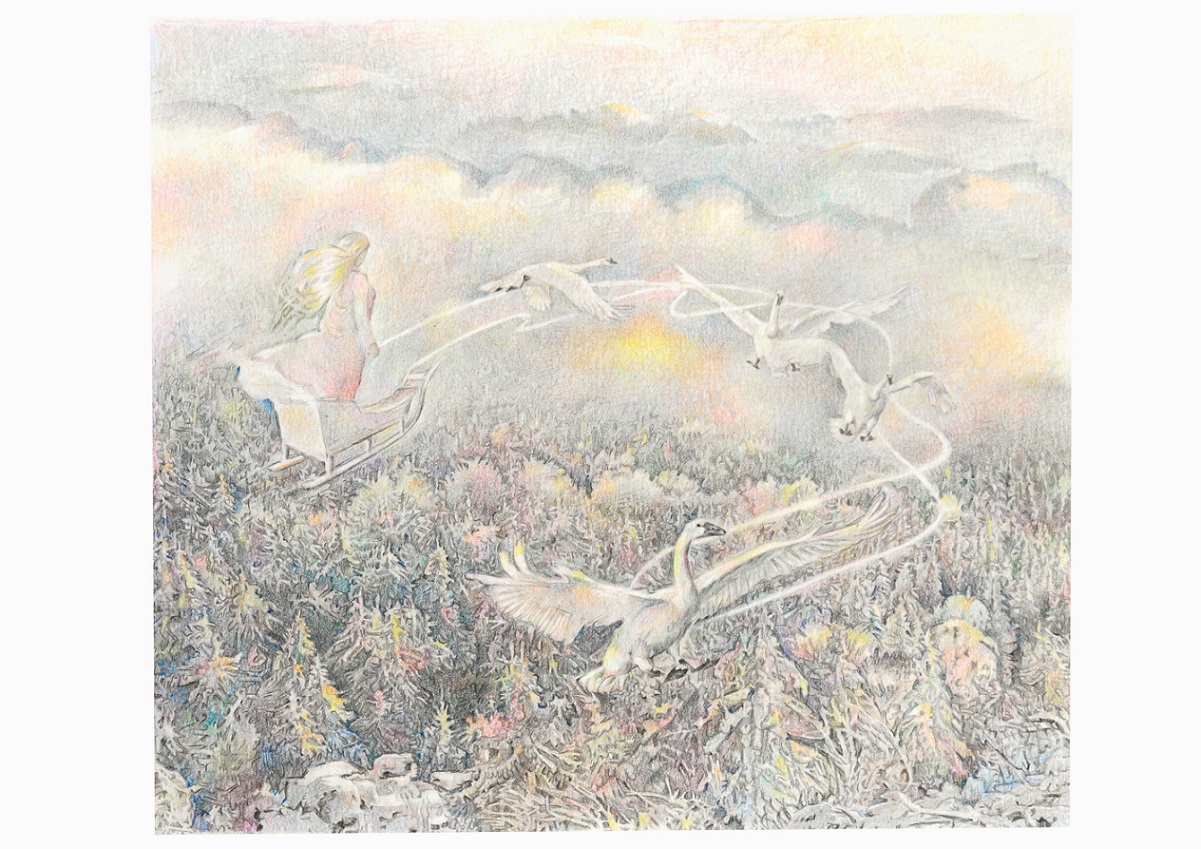 Sáně sněhové královny letící nad lesy, kresba pastelem, 26×21 cm